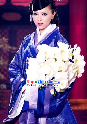 The costume features a traditional blue-purple color scheme, giving it an elegant and mysterious feel.