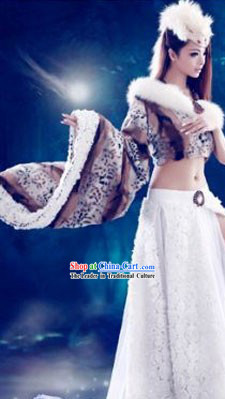 The costume includes a white fox fairy skirt with intricate embroidery patterns and a fox fairy hat with fur trimmings.