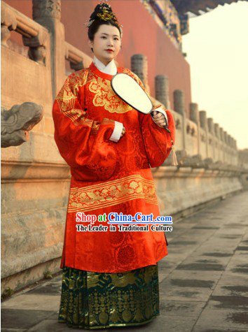 This artwork is a red female costume from the Ming Dynasty in ancient China, composed of exquisite embroidery and ornate decorations.