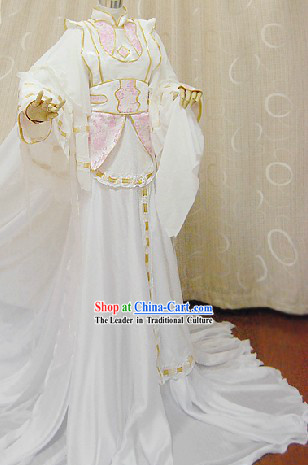 This is a set of ancient Chinese romantic white princess cosplay costumes, consisting of a white dress, white boots, and a white headdress.