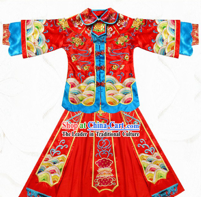 The dress employs traditional embroidery techniques, skillfully incorporating various patterns and symbols into the design, symbolizing happiness, completeness, and prosperity.