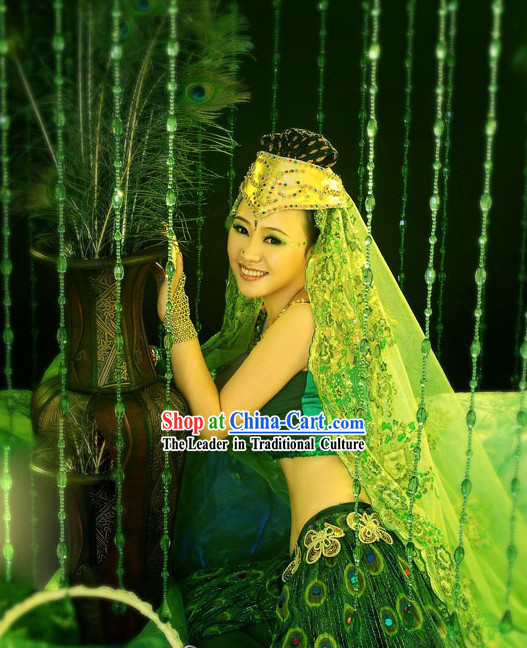 Wearing this set of green peacock dance costume and headdress, women exude a mysterious and enchanting aura.