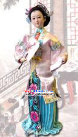 In terms of materials, the heads of foreign figurines are made of gesso, clay and wood, while Beijing silk figurines are all made of Chinese silk from head to toe -- their facial expressions, clothing and postures all tinged with the Chinese flavor.  Beijing silk figurines usually represent young men and women in Chinese folktales, traditional dramas and ethnic dancers. The subjects are primaryly characters from folk stories loved by China's common people, including ancient beauties, dramatic figurines and modern dancers.  The making of the figurines involves a dozen steps, including sculpting, painting, designing clothing and props, and arranging the hair and headgears. Each step requires sophisticated techniques and ingenious craftsmanship. Usually, the face and hands of a silk figurine are made of natural silk, while the other parts are made from fine silk cloth.  From head to toe, inside and out, only top quality Chinese silk and spun gauzes are used to make these craftworks.  The graceful and colorful Beijing silk figurines are exquisitely made, each with a different expression, bright colors and an elegant style. They are not only a rare specimen for indoor ornamentation, but also a stereoscopic piece for understanding Chinese history, local conditions and Tailor-mades. For a long time, Beijing silk figurines have been greatly valued and highly appreciated as collector's items.