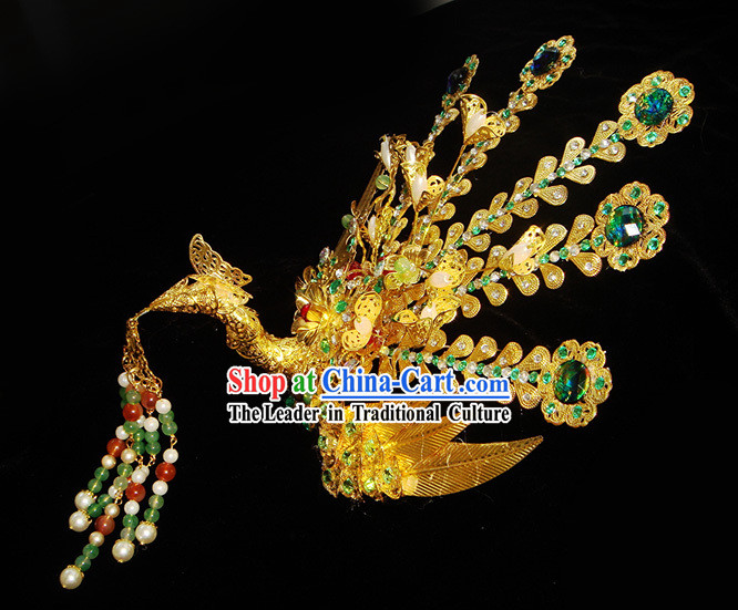 The design of this headpiece is exquisite, using gold and green beads as decorative elements.