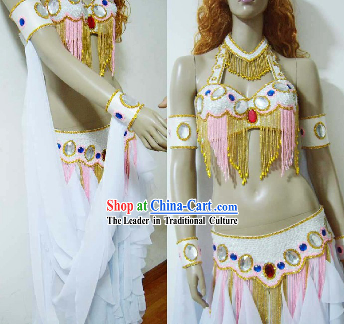 This is a very exquisite belly dance costume, which consists of a white and pink skirt, a golden belt, and a pink headdress.