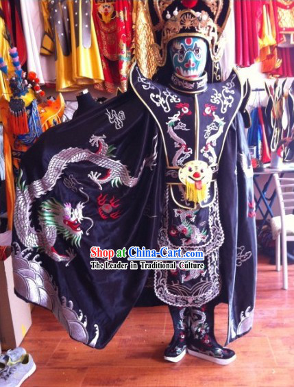 This artwork is a traditional Chinese black dragon mask costume, which includes a headdress, boots, and mask.