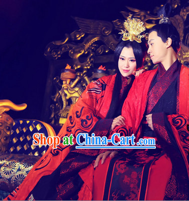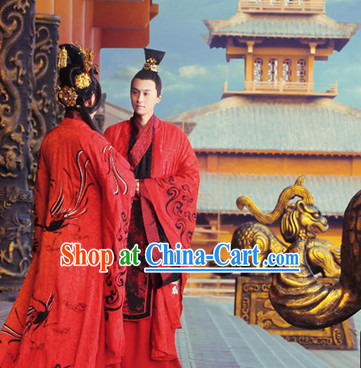 The brides are wearing traditional Chinese wedding dresses, which are red and black in color.