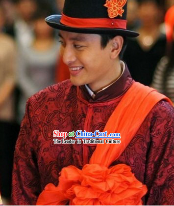 This artwork is a traditional Chinese bride's dress, which includes a red wedding gown, a black top hat, and a long red skirt.