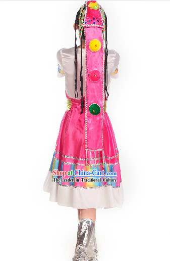 The costume incorporates traditional Tibetan elements such as vibrant colors, intricate patterns, and exquisite craftsmanship.