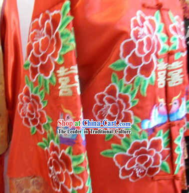 The artwork is a traditional Chinese wedding dress made of red silk.