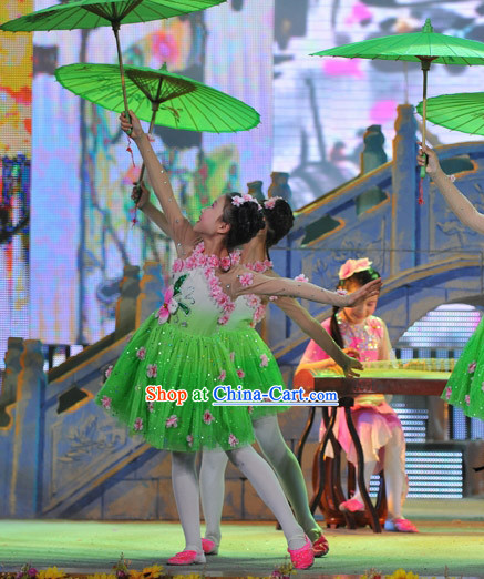 This image showcases the costumes of the traditional Chinese dance known as "Umbrella Dance".