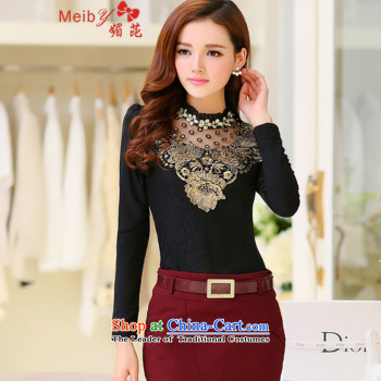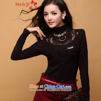 Large meiby female wild autumn and winter_, forming the thin lint-free t-shirt, Sau San warm lace t-shirt high collar roses Korea long-sleeved Pullover 8381 Black聽XL