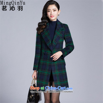 Tea Culture Qinyang Yu 2015 autumn and winter new gross? coats that long temperament grid long-sleeved jacket Green Grid gross? L