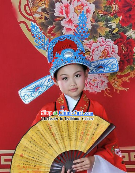 These garments and headpieces are made of red silk, intricately embroidered with various patterns and designs.