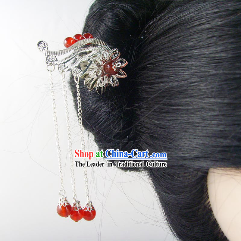The work is made from red beads and silver chains, which are skillfully woven together to form a unique hair accessory.