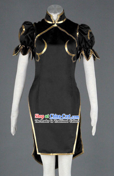 This artwork is a Chinese classical-style black Kung Fu Cheongsam dress designed for women.