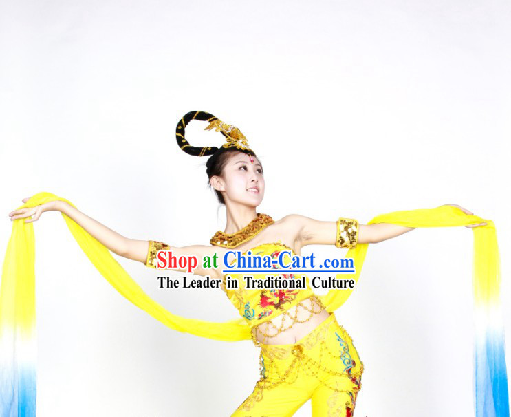 This artwork is a set of Chinese imperial palace dance costumes and female wigs, which represents a unique art form in ancient Chinese culture.