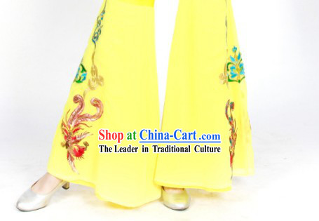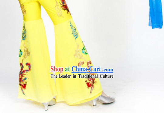The costumes are made of yellow and blue silk, adorned with exquisite patterns and decorations.