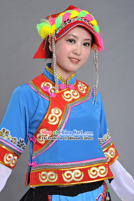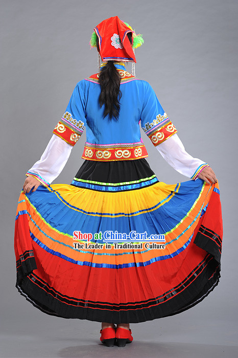 The costume features traditional design elements such as embroidery, needlework, and colorful patterns, which are symbols of Chinese ethnic minority culture.