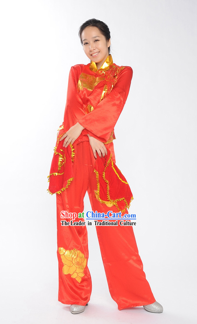 The costume incorporates traditional Chinese elements such as red, gold, and dragon patterns, which represent good fortune, prosperity, and luck.