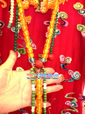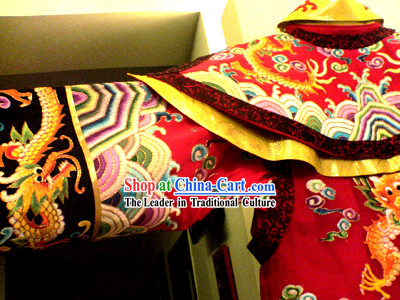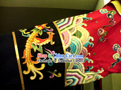 Additionally, the costume employs complex embroidery techniques that include various patterns and details such as dragon motifs, floral patterns, and cloud designs.
