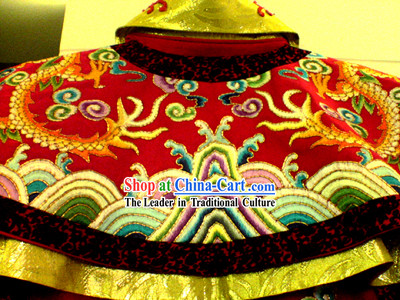 The costume is vibrant and ornate, with red as the primary color symbolizing power and prestige.