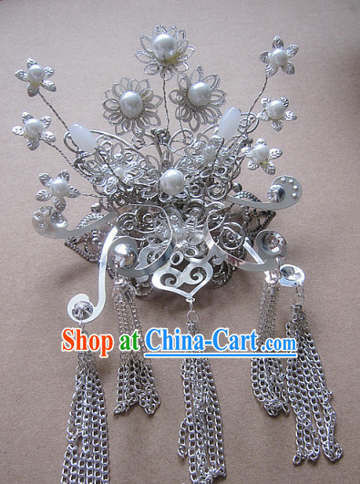 This is a traditional Chinese queen's hair accessory made of silver and white beads.