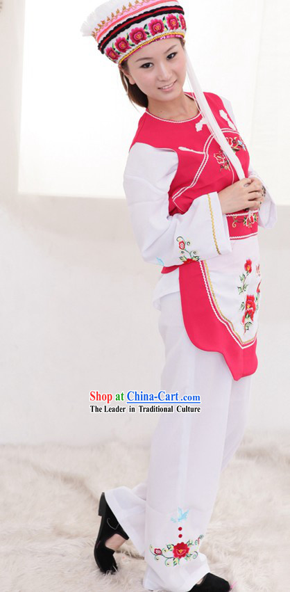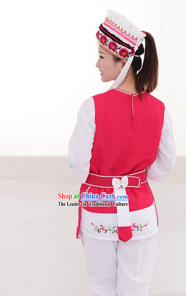 This is a complete set of traditional costumes for the Bai ethnic minority group in Yunnan, China.