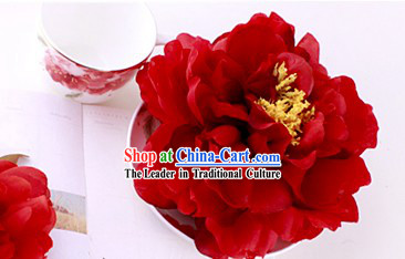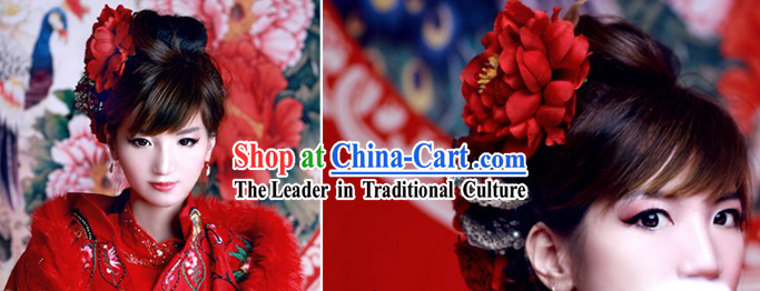 The painting shows a beautiful woman wearing a gorgeous red robe and a red flower on her head.
