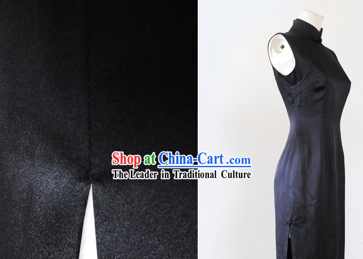 This artwork is a traditional Chinese black long silk cheongsam, designed for women.