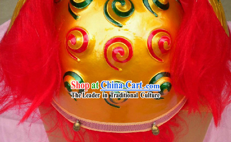The set includes a red and gold lion head mask, which is adorned with long hair and a fierce expression.