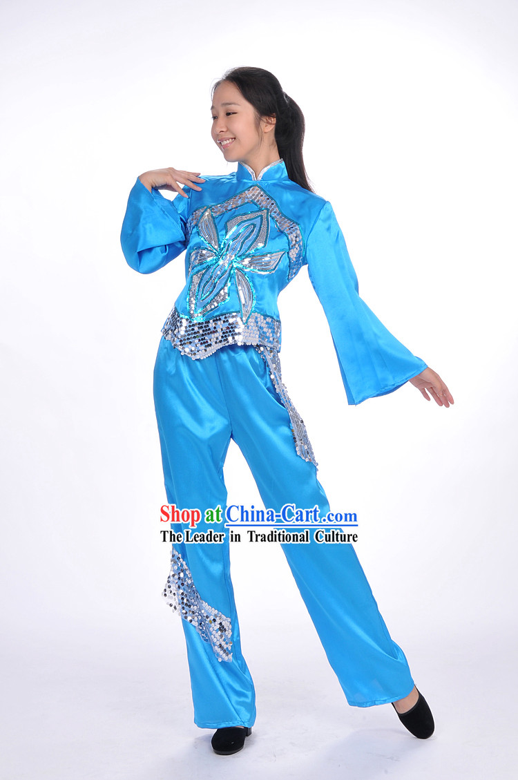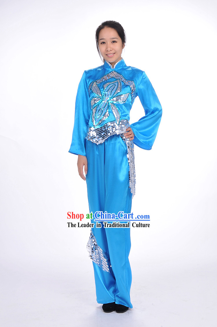 The woman's blue dress with yellow patterns is symbolic of good fortune and happiness in Chinese culture.