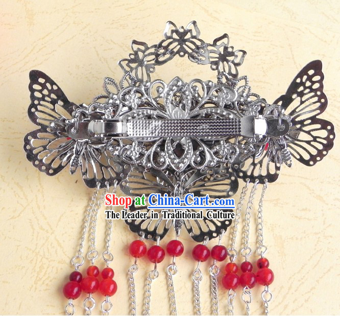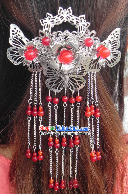 This is a traditional Chinese handmade hair accessory made of red beads and silver metal.