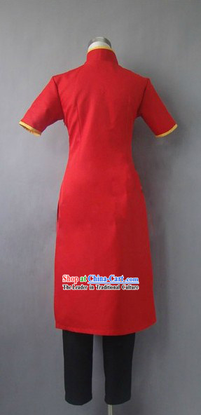 The costume features the color red as its main hue, symbolizing good fortune, prosperity, and happiness.