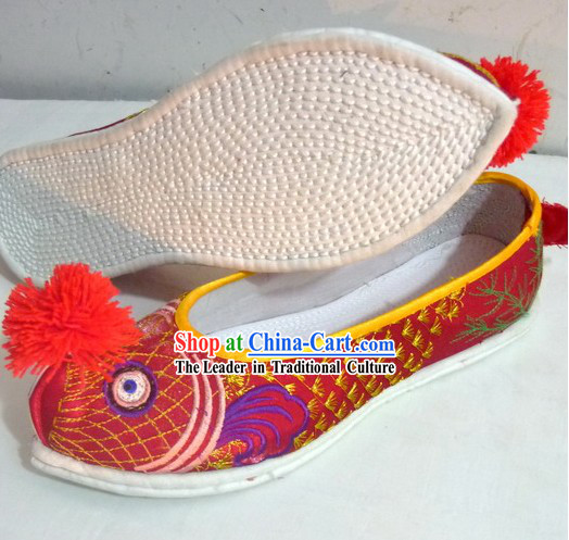 This pair of red fish shoes is a traditional Chinese wedding shoe, which represents happiness and good luck.
